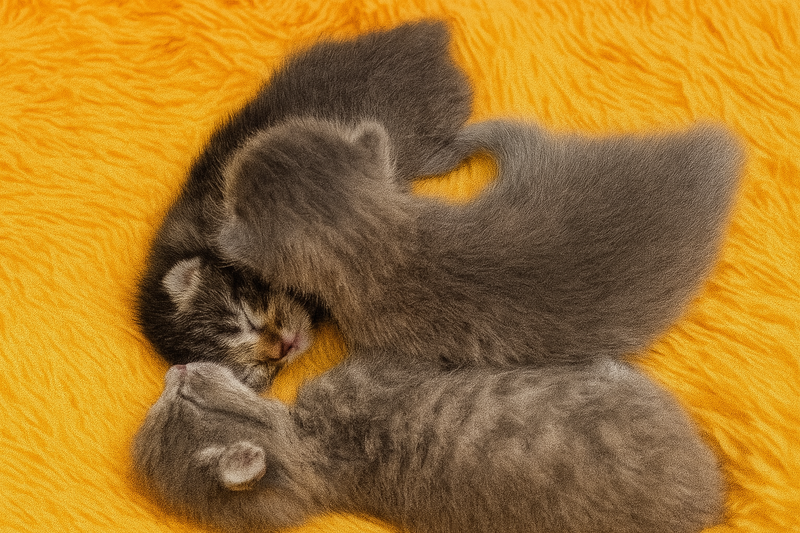 На дачный участок к нам пришла беременная кошка. Мама оказалась невероятно умной, ласковой и выносливой — всю зиму прожила на даче, ловила мышей. В середине мая 2025 года у нее родились трое чудесных котят — двое мальчиков и одна девочка.